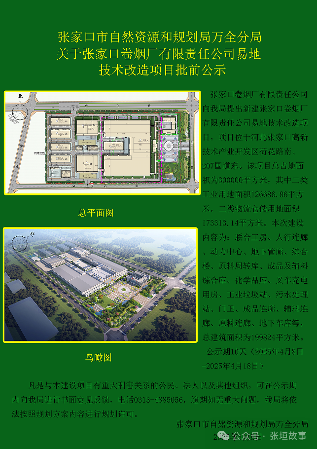 根据2025年发布的公告,张烟易地搬迁项目总投资40亿,新址位于高新技术产业开发区荷花路南、207国道东,占地面积500亩。项目建成后,将建成一座三星级绿色工房,集数字化、智能化于一体的卷烟加工厂,年生产卷烟90万箱以上,利税达120亿元的现代化智能卷烟工厂,可安排2500人就业。