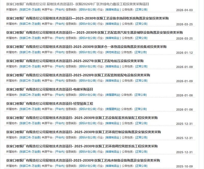 近日,河北省招投标网正式公布,张家口卷烟厂易地技术改造项目多项招标公告,这意味着这座近百年的老牌厂区搬迁步入快车道。招标公告包括厂区外电力敷设工程、工艺设备余热回收系统购置等多个项目:
