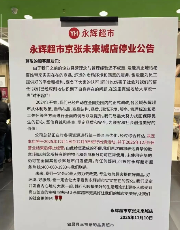 公司总部正在对各项资源进行统一整合与优化,经过综合评估,决定本店将于2025年12月1日至12月9日进行出清活动,并于2025年12月9日营业结束后停止经营,由此给您造成的不便,我们再次向您表达真挚的歉意!闭店前您所持有的购物卡和会员积分均可正常使用,未使用完毕的仍可在全国其他永辉超市门店使用。有任何疑问,可拨打永辉超市服务热线:400-060-1933与我们联系。