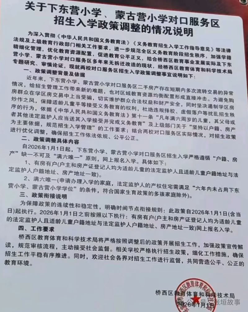 2026年1月1日,张家口桥西教育体育和科学技术局发布重要通知:《关于下东营、蒙古营小学对口服务区招生入学政策调整的情况说明》,内容是:自2026年1月1日起,张家口下东营小学、蒙古营小学对口服务区招生入学严格遵循"户籍、房产"缺一不可及"满六唯一"原则,核心政策如下:
