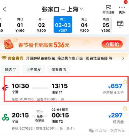 小编查了下票价,2月3日张家口-上海的的票价为657元(1月13日查询,价格仅供参考),飞行时间为2小时45分钟。