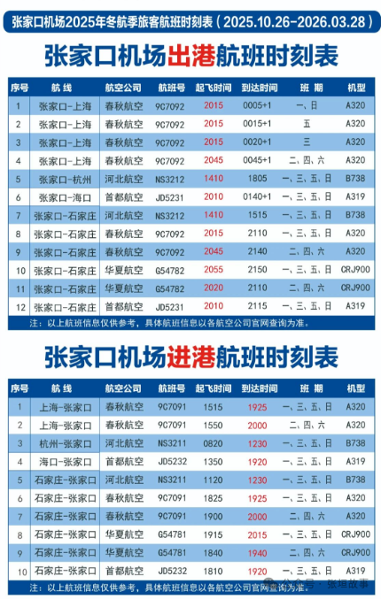 比之前的经停石家庄的飞行时间缩短1个多小时。这对于爱好出门的张家口人来说,真是个好消息,之前小编写过《张家口直飞航线,仅剩下一根独苗了?》,现在总算又恢复一条直飞上海的,可喜可贺~希望2026年张家口能有更多直飞航班。最后附上张家口进出港航班时刻,请收藏: