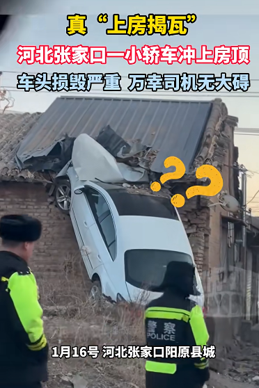 1月16号,张家口阳原县城网友爆料,一辆小车竟然冲上民房屋顶,画面显示,一辆白色小车呈直立姿态趴在一栋民房墙上,车头插入砖瓦房斜顶。现场有警察勘察,随后有吊车来到现场,把车辆取下后发现车头损毁严重,气囊弹出,所幸司机并无大碍。
