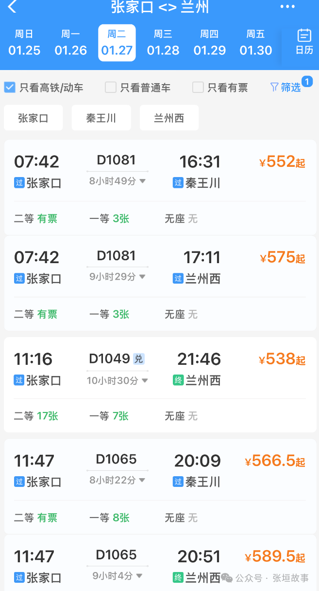 1月27日起开通,之前张家口有一趟直达兰州的动车,全程10小时30分。现在新增加4趟,全程最短时间约9小时,二等座票价在538~589元。