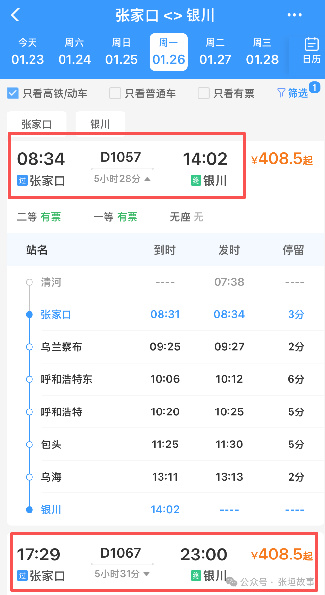 1月26日起开通,二等座票价408.5元,行车时间5个半小时(之前K字打头的需要14个小时)。途径呼市、包头,一天有两趟,分别是上午8:34和下午17:29。