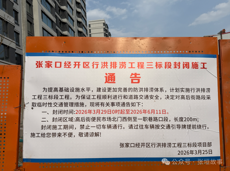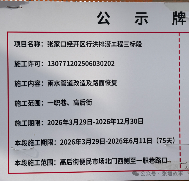 近日,张家口这条“老大难"问题的破路,终于开工修建了!根据《张家口经开区行洪排涝工程三标段封闭施工通告》,高后街施行洪排涝工程三标段工程,对高后街路段采取临时性交通管理措施: