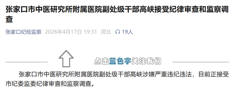 张家口市中医研究所附属医院副处级干部高峡涉嫌严重违纪违法,目前正接受市纪委监委纪律审查和监察调查。